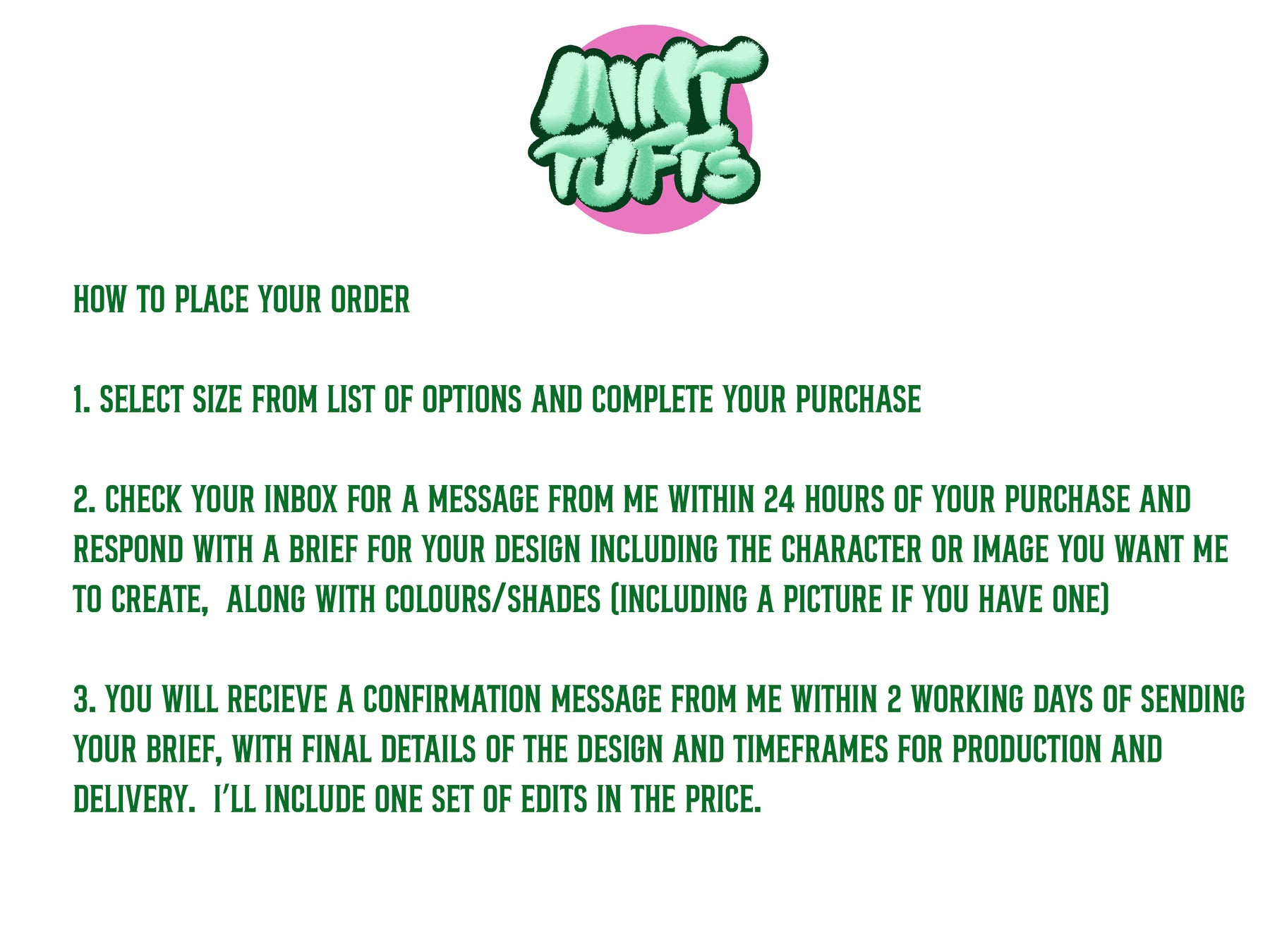 Made by MintTufts, each Custom Rug is carefully designed and tufted by hand, making every piece one-of-a-kind. It’s my goal to bring your design to life in a way that you’ll love and cherish! Each Rug is more than just décor; it’s a unique addition to your merch or fan collection, or simply an expression of your personal style.